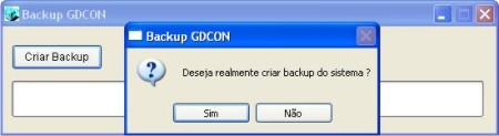 Após abrir o programa de backup clique no botão Criar Backup, após a tela de sucesso, será criado na pasta de instalação do GDCON um arquivo chamado BACKUP.ZIP com todos os arquivos necessários para poder restaurar o estado atual do GDCON a qualquer momento.